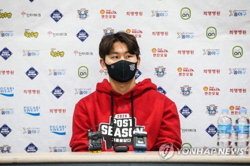 ▲ So Hyeong-jun of the KT Wiz speaks to reporters before Game 2 of the Korea Baseball Organization second-round postseason series at Gocheok Sky Dome in Seoul on Nov. 10, 2020. (Yonhap)