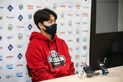 ▲ 인터뷰하는 소형준 (서울=연합뉴스) 한종찬 기자 = 10일 오후 서울 구로구 고척스카이돔에서 열린 2020 프로야구 포스트시즌 플레이오프(PO) 2차전 두산 베어스와 kt wiz의 경기. 경기 전 KT 소형준 투수가 인터뷰를 하고 있다. 2020.11.10 saba@yna.co.kr
