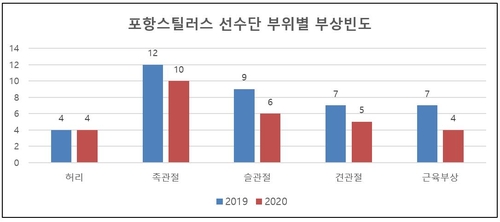 | ▲ 포항 구단 선수단 부위별 부상 빈도 비교표(파란색 2019년·붉은색 2020년) [포항 스틸러스 제공. 재판매 및 DB 금지] |