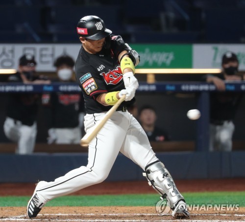 | ▲ In this file photo from Sept. 10, 2020, Park Kyung-su of the KT Wiz hits a three-run home run against the NC Dinos during the top of the sixth inning of a Korea Baseball Organization regular season game at Changwon NC Park in Changwon, 400 kilometers southeast of Seoul. (Yonhap) |