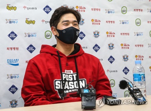 | ▲ Park Kyung-su of the KT Wiz speaks to reporters at Gocheok Sky Dome in Seoul on Nov. 9, 2020, before Game 1 of the second round Korea Baseball Organization postseason series against the Doosan Bears. (Yonhap) |