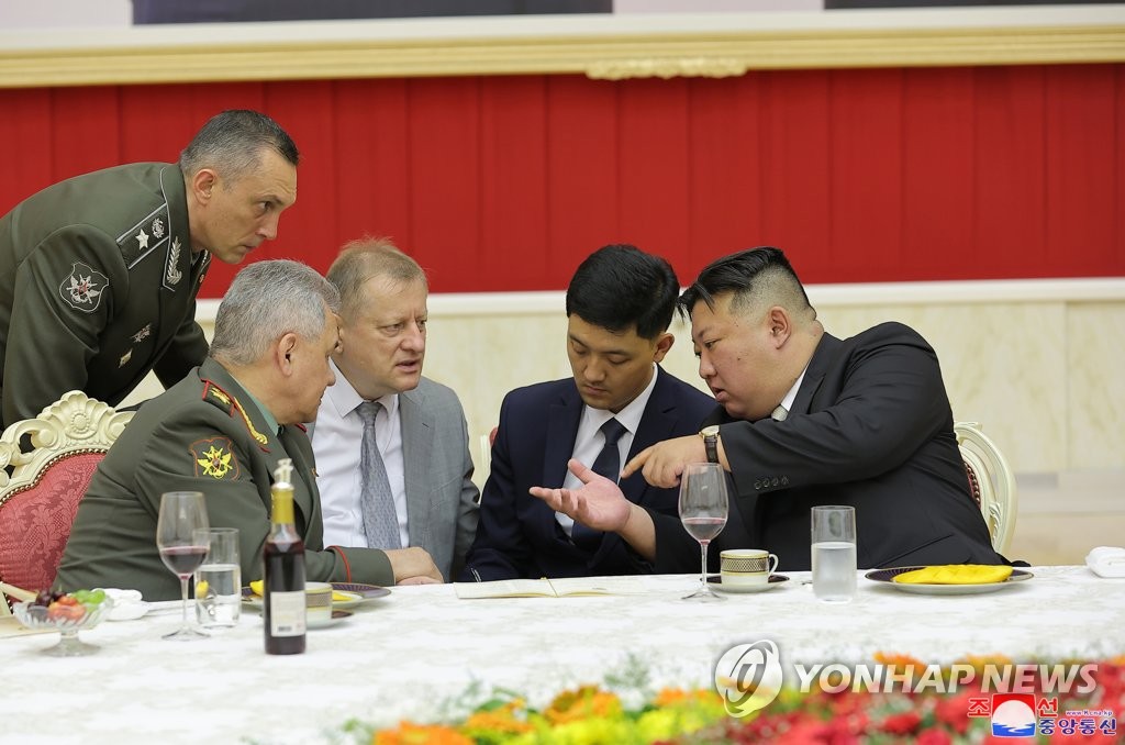 | ▲ This photo, released by the North's official Korean Central News Agency on July 28, 2023, shows North Korean leader Kim Jong-un (R) talking with Russian Defense Minister Sergei Shoigu (L, sitting) during a reception for the minister and his military delegation in Pyongyang the previous day. The delegation visited the North to attend a ceremony to mark the 70th anniversary of the Korean War armistice agreement on July 27. (For Use Only in the Republic of Korea. No Redistribution) (Yonhap) |