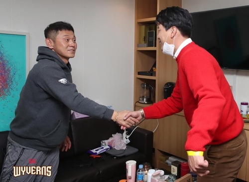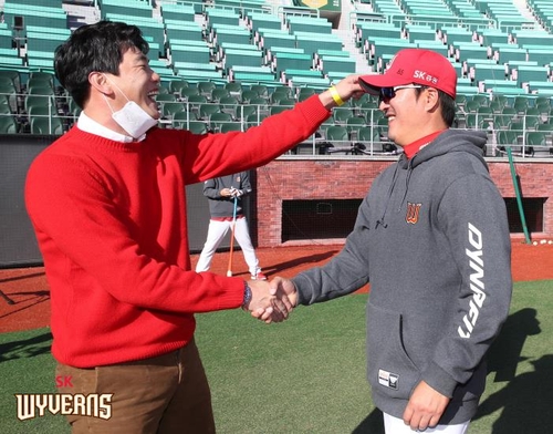| ▲ 친정팀 SK 와이번스 방문한 김광현 세인트루이스 카디널스 김광현(오른쪽)이 23일 인천 SK행복드림구장을 찾아 친정팀 SK 와이번스 박경완 감독대행과 반갑게 인사하고 있다. [SK 와이번스 제공. 재배포 및 DB 금지] |