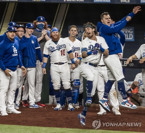 | ▲ 기뻐하는 다저스 선수단 (알링턴 EPA=연합뉴스) 로스앤젤레스 다저스 선수들이 19일(한국시간) 미국 텍사스주 알링턴 글로브라이프필드에서 열린 미국프로야구 내셔널리그 챔피언십시리즈 7차전, 코디 벨린저가 7회말 역전 솔로 홈런을 치자 더그아웃 앞에서 기뻐하고 있다. |