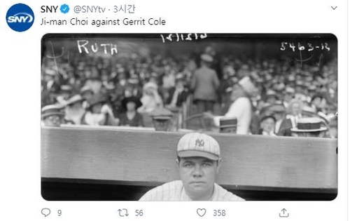 | ▲ "콜을 만난 최지만은 베이브 루스" 미국 스포츠넷 뉴욕이 6일(한국시간) 트위터 계정을 통해 뉴욕 양키스 게릿 콜을 상대하는 탬파베이 레이스의 최지만을 전설적인 야구선수 베이브 루스로 묘사했다. [스포츠넷 뉴욕 트위터 계정 캡처. 재배포 및 DB금지.] |