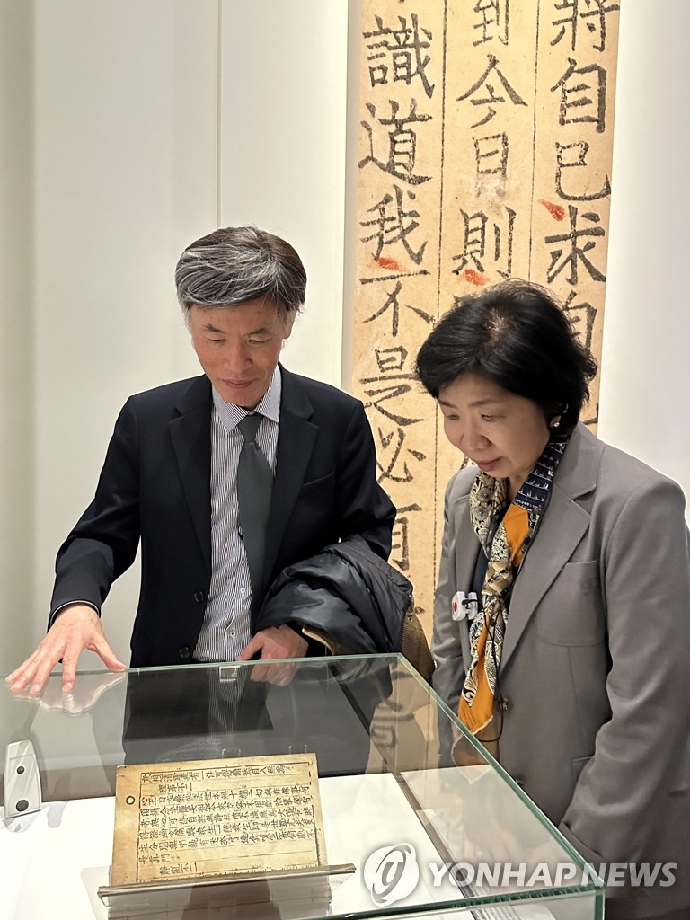 | ▲ 직지 살펴보는 김정희 국외소재문화재재단 이사장 (서울=연합뉴스) 김정희 국외소재문화재재단 이사장(오른쪽)이 11일(현지시간) 프랑스 파리에서 세계에서 가장 오래된 금속활자 인쇄본 '직지(直指)' 공개 특별전 '인쇄하다! 구텐베르크의 유럽(IMPRIMER! L'EUROPE DE GUTENBERG)'에 참석해 이일열 주프랑스 파리문화원장과 전시된 직지를 살펴보고 있다. 2023.4.12 [문화재청 제공. 재판매 및 DB 금지] photo@yna.co.kr |