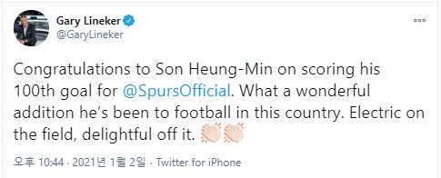 | ▲ 손흥민의 토트넘 통산 100호골을 축하하는 개리 리네커. [개리 리네커 트위터 캡처] |