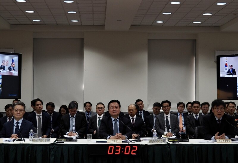 | ▲ South Korean Ambassador to the United States Cho Hyun-dong (C) attends a parliamentary audit session at the South Korean Embassy in Washington on Oct. 15, 2023. (Pool photo) (Yonhap) |