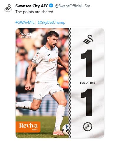 | ▲ 밀월과의 무승부 소식을 전한 스완지 시티. [스완지 시티 구단 SNS. 재판매 및 DB 금지] |