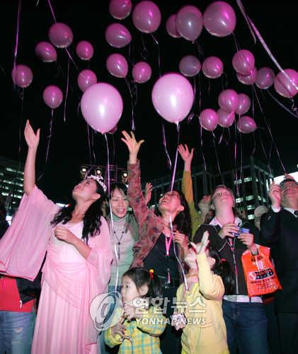 ▲ 유방암 인식 캠페인 서울시청광장에서 열린 '2005 유방암 자각 캠페인'에 참가한 시민들이 유방암 예방의 상징색인 핑크색으로 된 풍선을 하늘로 날려보내고 있다./서명곤/사회/ 2005.10.12 (서울=연합뉴스