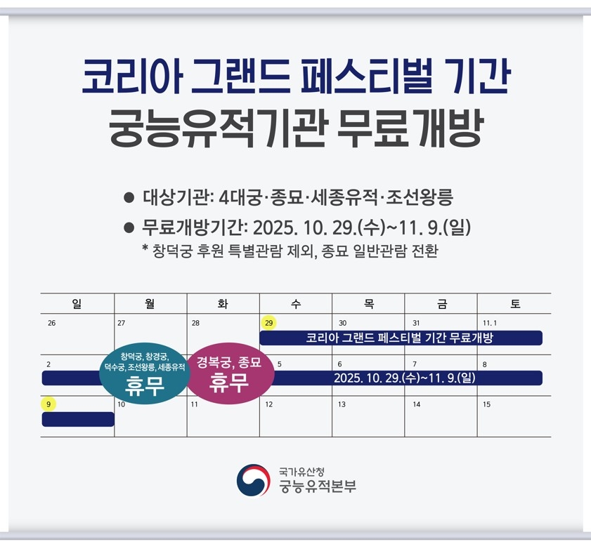 궁능유적본부 측은 "국민 참여를 늘리고 문화 향유권을 증진하기 위해 '코리아 그랜드 페스티벌' 기간에 관람객이 무료로 입장하도록 할 것"이라고 전했다.