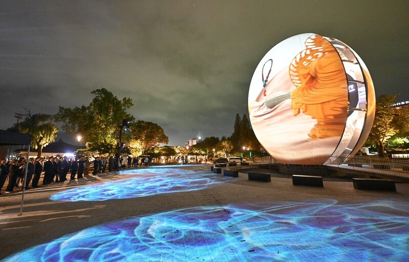 ▲ 경주에 펼쳐진 APEC '빛의 향연' (경주=연합뉴스) 김현태 기자 = 15일 오후 경북 경주시 보문단지 호반 광장에서 APEC 보문단지 야간경관개선 '빛의 향연' 시연회가 진행되고 있다. 시연회에서 거대한 알 모양의 APEC 상징 조형물에 미디어 아트가 진행되고 있다. 2025.10.15 mtkht@yna.co.kr |