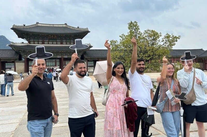 | ▲ '갓 부채' 들고 경복궁서 '찰칵' (서울=연합뉴스) 김예나 기자 = 3일 서울 종로구 경복궁을 찾은 외국인 관광객들이 갓 모양 부채를 들고 기념 촬영을 하고 있다. 국가유산청은 추석 연휴를 맞아 9일까지 경복궁·창덕궁·덕수궁·창경궁 등 서울의 4대 궁과 종묘, 조선왕릉을 무료로 개방한다. 2025.10.3 yes@yna.co.kr |