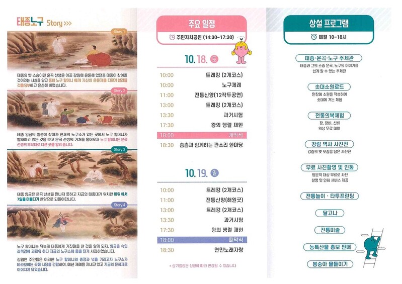 '태종과 노구, 역사의 숨결을 걷다'를 주제로 한 올해 행사는 강림 천혜의 자연환경과 유서 깊은 역사문화를 함께 느낄 수 있는 다채로운 프로그램으로 펼쳐진다.