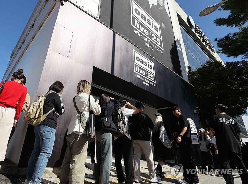 ▲ 을지로에 오픈한 오아시스 팝업 스토어 (서울=연합뉴스) 이재희 기자 = 내한 공연을 앞둔 영국 밴드 오아시스가 16일 서울 중구 을지로3가역 인근에 오픈한 '오아시스 라이브 '25 팬 스토어'에서 팬들이 입장을 기다리고 있다. 이곳에서는 오아시스 로고가 담긴 의류와 액세서리, 이번 공연 한정판 기념품 등을 판매한다. 2025.10.16 scape@yna.co.kr |