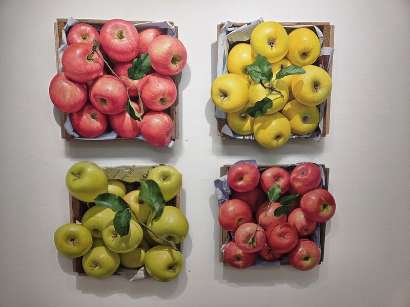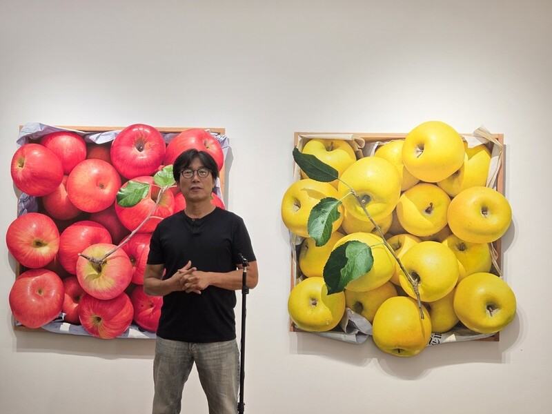 전시장에서 만난 작가는 "처음에는 접시 위에 사과를 놓고 그리다 큰 작품을 그려야겠다고 생각하던 차에 나무상자에 쌓여 있는 사과를 보고 아이디어를 얻었다"며 "관람객들이 제 사과 그림을 보고 신기해하고 행복해하는 모습을 보면서 그 뒤로 사과에 집중하고 있다"고 말했다.