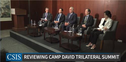 | ▲ South Korean Ambassador to the United States Cho Hyun-dong (second from L), Kurt Campbell, U.S. National Security Council coordinator for Indo-Pacific affairs (C), and Japanese Ambassador to the U.S. Tomita Koji (fourth from L) are seen taking part in a forum hosted by the Center for Strategic and International Studies in Washington on Aug. 29, 2023 in this captured image. (Yonhap) |