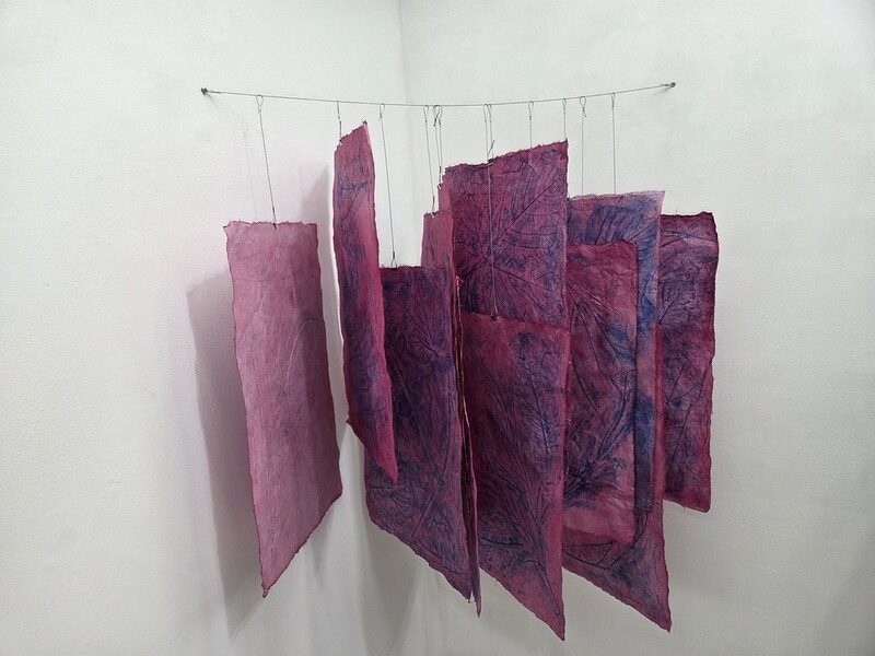 2025년 작 '현자의 돌을 찾기 위한 의식'은 이런 오류의 과정으로 만들어진 작품이다. 종이 제작 과정에서 닥나무 잎이라는 이물질을 넣고 문질러 종이 표면에 닥나무잎 무늬가 새겨지게 했다.