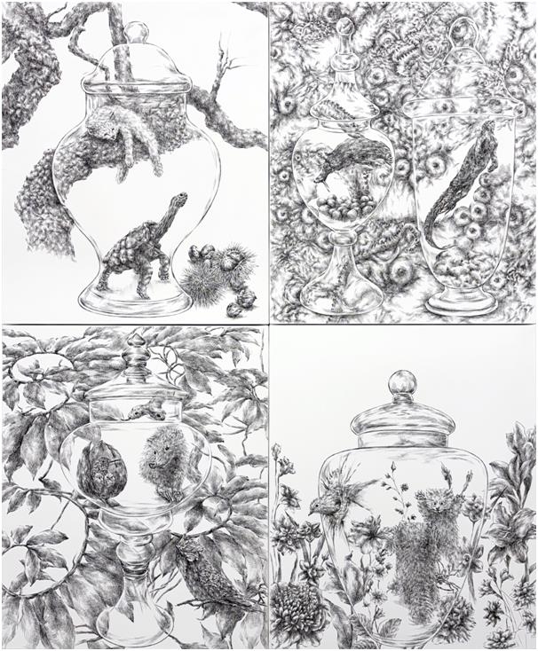 작가는 주로 펜으로 '크로스 해칭' 기법을 사용해 그림을 그린다. 얇은 선을 그물처럼 교차해 면을 표현하는 방식이다. 작가는 어린 시절 전문적인 바둑 교육을 받았는데, 마치 수많은 바둑판들이 모여 그림으로 탄생한 것 같다.