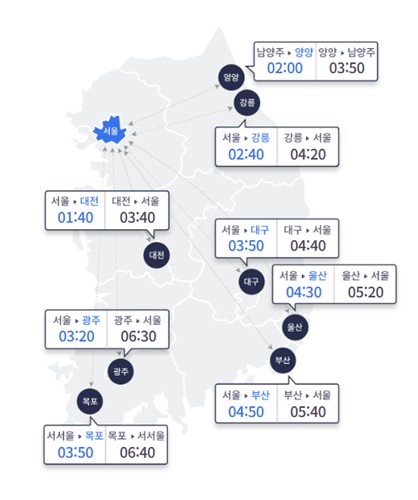 반대로 서울에서 각 도시까지 소요 시간은 부산 4시간 50분, 울산 4시간 30분, 대구 3시간 50분, 광주 3시간 20분, 강릉 2시간 40분, 대전 1시간 40분이다.