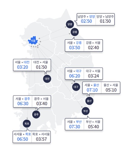 각 도시에서 서울까지 예상 소요 시간은 부산 5시간 40분, 울산 5시간 10분, 광주 3시간 40분, 대구 3시간 24분, 강릉 2시간 40분, 대전 1시간 50분이다.