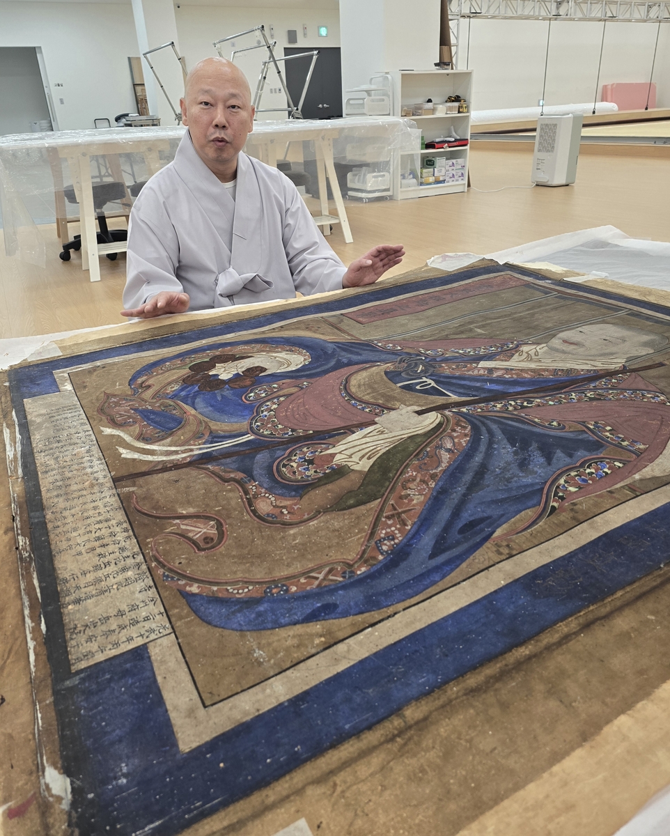 | ▲ 훼손된 불화 보존처리하는 불교문화유산보존센터 (양평=연합뉴스) 이세원 기자 = 9월 25일 경기 양평군 소재 불교문화유산보존센터에서 이 센터를 관할하는 불교문화유산연구소 소장 혜공스님이 배접지 교체가 필요한 불화에 관해 설명하고 있다. |