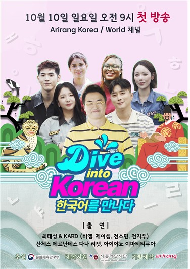 세종학당재단과 아리랑국제방송이 공동 제작한 교육 방송 4부작 '한국어를 만나다'(Dive into Korean)도 10일 오전 아리랑TV를 통해 전 세계 107개국에 첫 방송 된다. 인기 한국사 강사 최태성이 진행하는 이번 프로그램에는 세종학당 장학생을 비롯해 실제 외국인 수강생들이 참여했다.