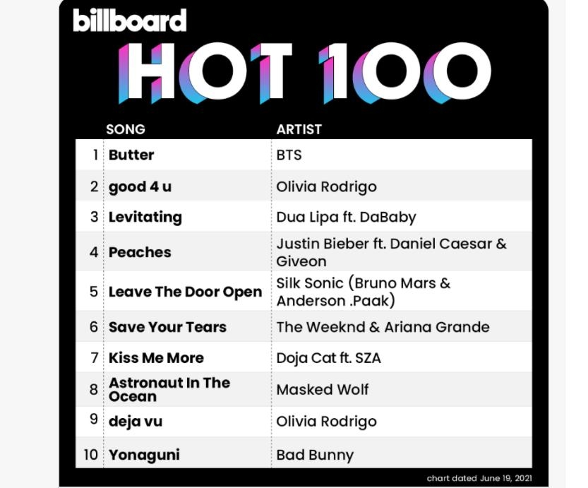 빌보드는 BTS의 '버터'가 메인 싱글 차트 '핫 100'에서 1위를 기록했다고 14일(현지시간) 밝혔다.