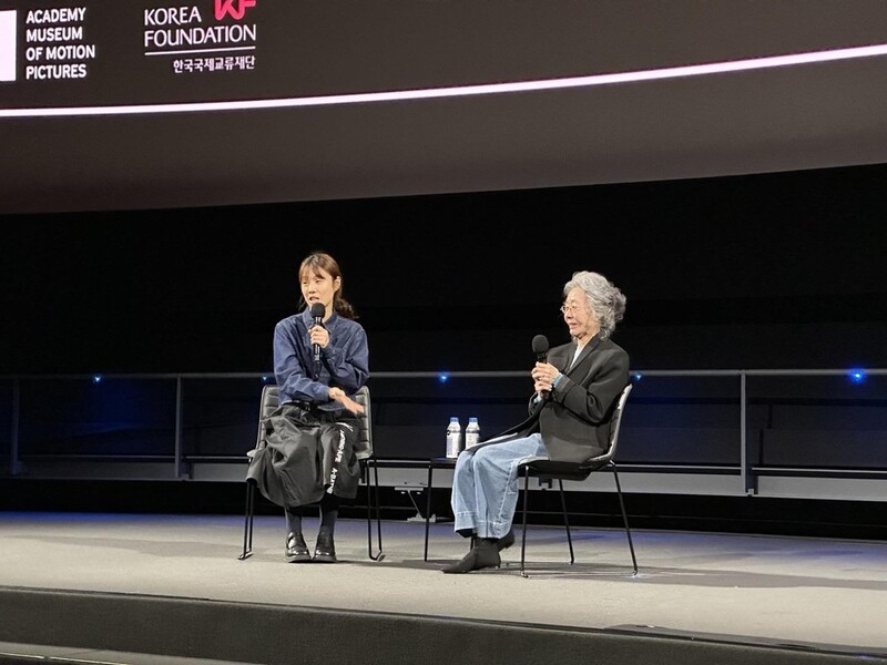 | ▲ 미국 아카데미영화박물관이 개최한 회고전에 참석해 대담하는 윤여정(오른쪽) (로스앤젤레스=연합뉴스) 임미나 특파원 = 배우 윤여정이 17일(현지시간) 미국 로스앤젤레스(LA) 아카데미영화박물관에서 영화 '미나리' 상영이 끝난 뒤 관객들 앞에서 대담하고 있다. mina@yna.co.kr |