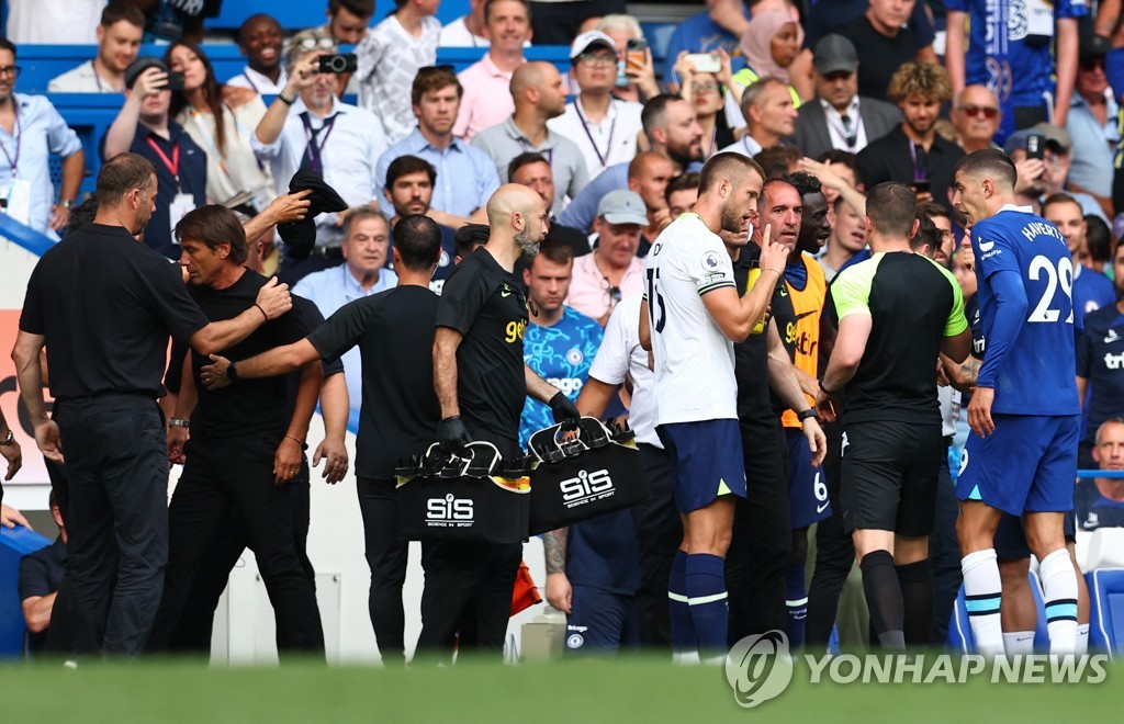 토트넘의 골 상황에 앞서 첼시 카이 하베르츠에 대한 토트넘 로드리고 벤탄쿠르의 강한 태클이 파울 선언 없이 지나간 상황에 대한 신경전 등이 뒤섞인 장면으로 보인다.