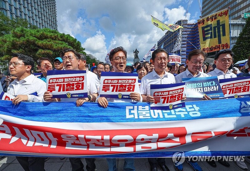 | ▲ Lawmakers and party officials of the main opposition Democratic Party, including the party's chief Lee Jae-myung (2nd from R), march toward the presidential office after staging a protest at Gwanghwamun Square in Seoul on Aug. 25, 2023, calling for Japan to stop the discharge of contaminated water from its nuclear power plant in Fukushima. (Yonhap) |