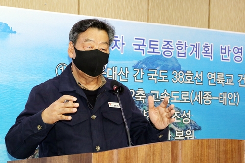 | ▲ 해양 치유산업 육성 방침 밝히는 가세로 태안군수 (태안=연합뉴스) 이은파 기자 = 가세로 충남 태안군수가 6일 군청 회의실에서 기자회견을 열고 해양 치유산업 육성 방침을 밝히고 있다. 2020.11.6 |