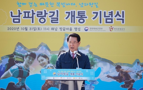 (해남=연합뉴스) 여운창 기자 = 남도문화와 해양·섬 관광을 잇는 '남파랑길' 개통 선포식이 31일 전남 해남 땅끝마을 맴섬에서 열려, 남해안 '블루투어'가 본격적으로 시작됐다.