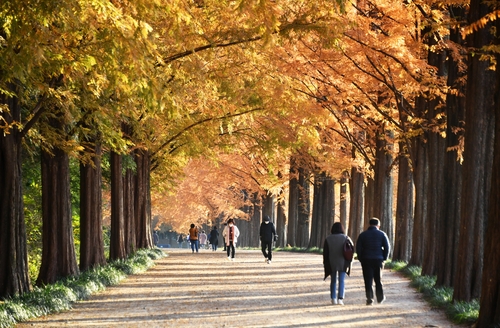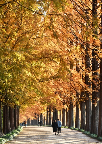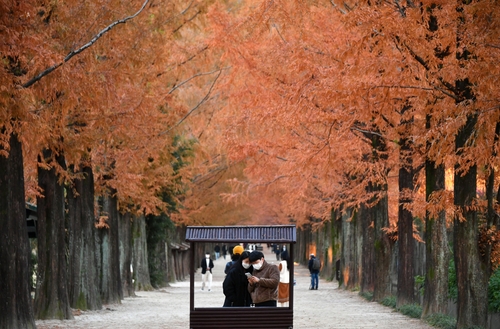 쌀쌀한 날씨에도 메타세쿼이아길을 찾은 나들이객들이 늦가을의 정취를 물씬 느끼고 있다.