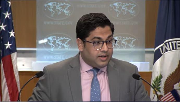 | ▲ Vedant Patel, deputy spokesperson for the Department of State, is seen answering questions during a daily press briefing at the state department in Washington on May 15, 2023 in this captured image. (Yonhap) |