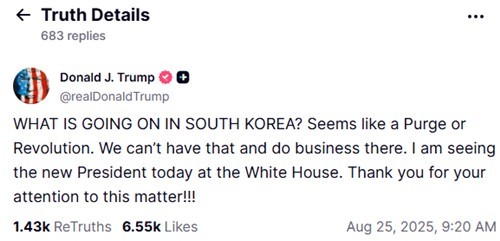 This screenshot shows a Truth Social post by U.S. President Donald Trump on Aug. 25, 2025, in which he said there seems to be something like a "purge or revolution" in South Korea, as he is set to have a summit with President Lee Jae Myung on the day. Shortly after Trump's post, South Korea's presidential office said it will check the situation. (PHOTO NOT FOR SALE) (Yonhap)