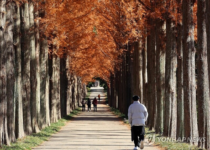 | ▲ 겨울로 가는 길목 (나주=연합뉴스) 조남수 기자 = 30일 오후 전남 나주시 전라남도산림자원연구소에서 시민들이 메타세쿼이아길을 걷고 있다. 2023.11.30 iso64@yna.co.kr |