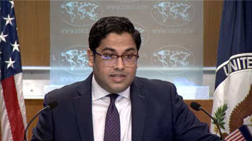 | ▲ Vedant Patel, deputy spokesperson for the Department of State, is seen speaking during a daily press briefing at the department in Washington on May 17, 2023 in this captured image. (Yonhap) |