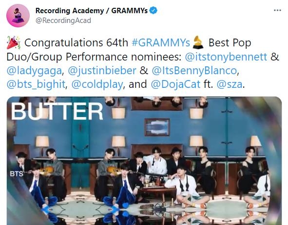 김도헌 대중음악평론가는 "BTS는 이미 미국 음악 시장에서도 굉장히 이름 난 팝스타"라며 "올해 빌보드 등 차트 성적을 놓고 본다면 '버터'는 최고의 히트곡이라 (그래미에서도) 배제하기 어렵다"고 말했다.