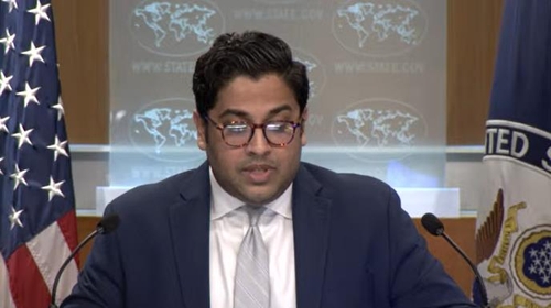 ▲ Vedant Patel, deputy spokesperson for the Department of State, is seen speaking during a press briefing at the department in Washington on April 6, 2023 in this captured image. (Yonhap)