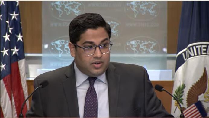 | ▲ State department deputy spokesperson Vedant Patel is seen answering questions during a daily press briefing at the department in Washington on May 3, 2023 in this captured image. (Yonhap) |