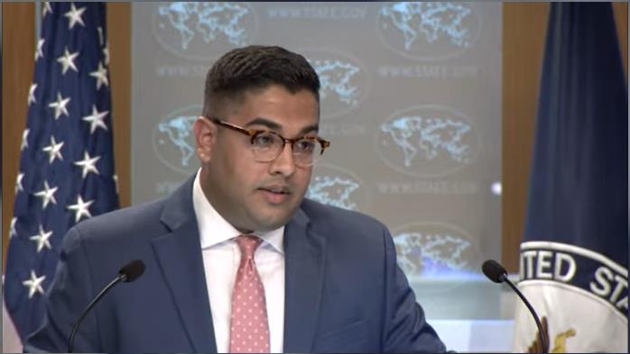 | ▲ Vedant Patel, principal deputy spokesperson for the U.S. Department of State, is seen answering questions during a daily press briefing in Washington on Sept. 6, 2022 in this image captured from the department's website. (Yonhap) |