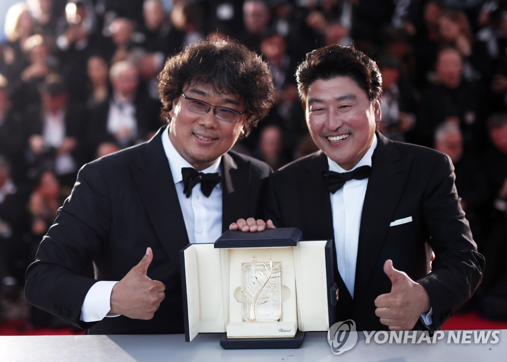 봉 감독이 등장하자 송강호는 만면에 환하게 미소를 띤 채 박수를 치면서 칸 영화제 무대 위에서 약 2년 2개월만의 동행을 만끽했다.