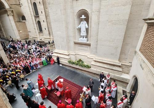 ▲ A ceremony is under way to bless the installation of the statue of St. Andrew Kim Tae-gon (1821-1846), the first Korean native Catholic priest, on the exterior wall of St. Peter's Basilica in Vatican City on Sept. 16, 2023. (Yonhap)