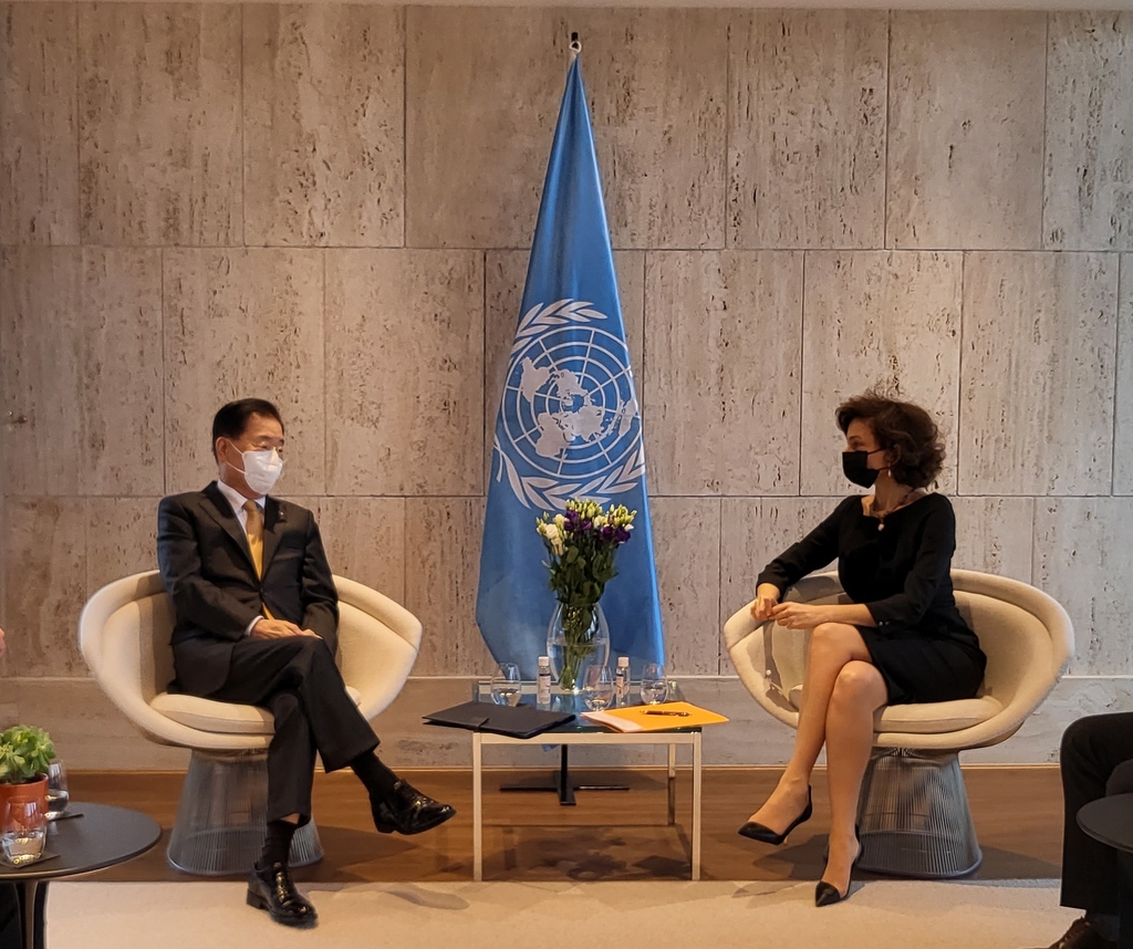 프랑스 외교부가 주최하는 '인도·태평양 협력에 관한 장관회의' 참석차 파리를 찾은 정 장관은 이날 오후 유네스코 본부에서 오드레 아줄레 유네스코 사무총장을 40여분간 면담했다.
