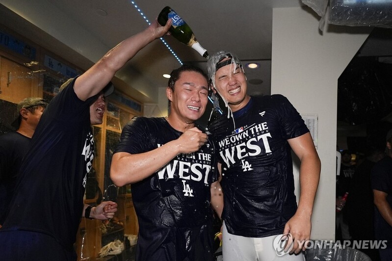 | ▲ NL 서부지구 우승 후 야마모토와 샴페인 샤워 중인 오타니(오른쪽) [AP=연합뉴스 자료사진] |