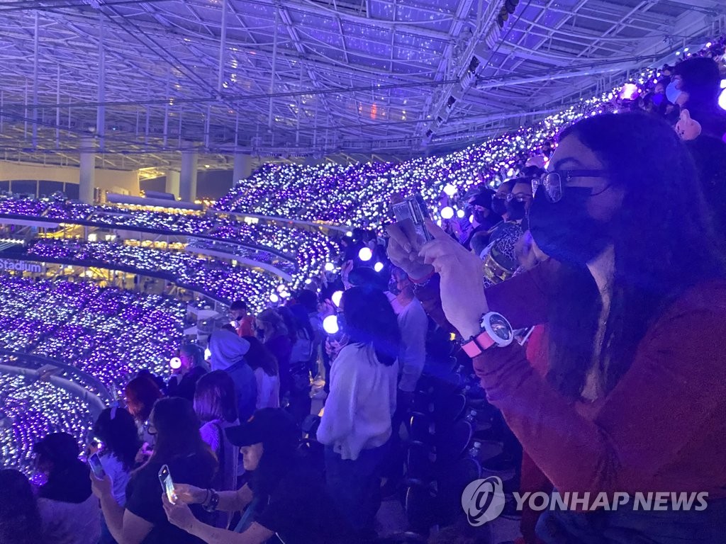 | ▲ BTS 콘서트 '퍼미션 투 댄스 온 스테이지' LA서 개막 (로스앤젤레스=연합뉴스) 27일(현지시간) 미국 로스앤젤레스(LA) 소파이 스타디움에서 2년 만에 개최된 방탄소년단(BTS)의 첫 대면 콘서트 '퍼미션 투 댄스 온 스테이지'(Permission to Dance on stage)에서 관객들이 무대를 관람하고 있다. 이날 개막한 콘서트는 28일과 다음 달 3~4일에 이어진다. 2021.11.28 [독자 제공. 재판매 및 DB 금지] photo@yna.co.kr |