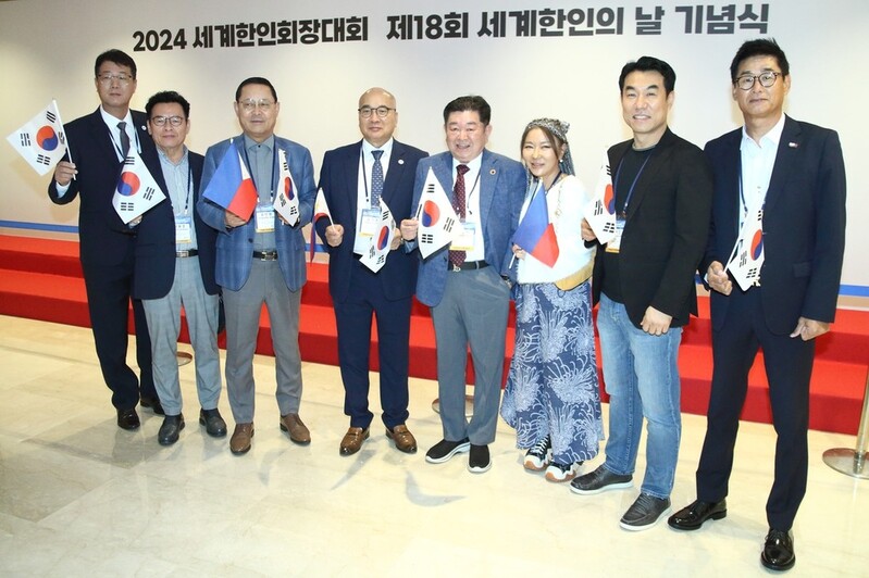 | ▲ '2024 세계한인회장대회' 참석한 필리핀 지역 한인회장들 (서울=연합뉴스) 성도현 기자 = 재외동포청이 주최한 '2024 세계한인회장대회' 참석차 방한한 윤만영 필리핀한인총연합회장(왼쪽에서 세 번째)과 필리핀 각 지역 한인회장이 지난 1일 행사장인 서울 송파구 롯데호텔월드에서 기념 촬영하고 있다. 2024.10.3 raphael@yna.co.kr |