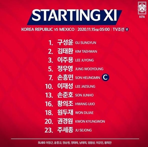 | ▲ 벤투호 멕시코전 베스트 11 명단 [대한축구협회 인스타그램 캡처. 재판매 및 DB 금지] |