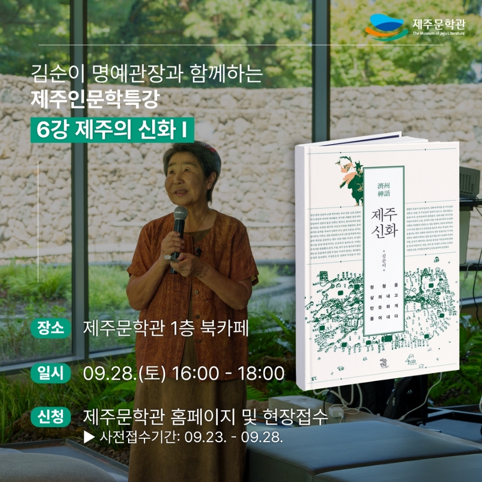 김순이 명예관장의 저서 '제주신화'를 바탕으로 한 저자 직강으로 이뤄지는 특강은 우리 민족 고대 신화의 원형이 살아 있는 제주도를 '일만팔천 신들의 고향'으로 조명하며, 제주 신화의 특별함을 소개한다.